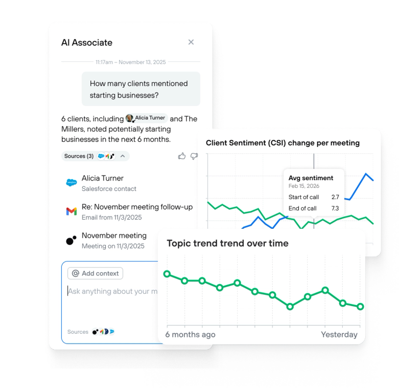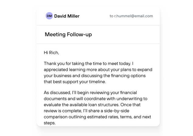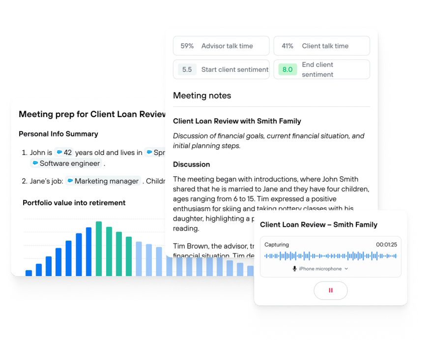 *This is a hypothetical scenario and not meant to be a guarantee of results. Each finserv professional's mileage with automated features such as meeting prep, notetaking, smart tasks, and follow-ups may vary.