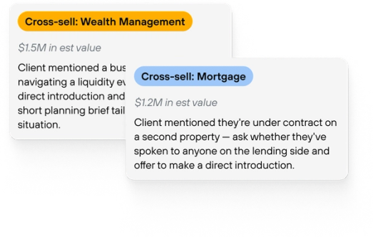 Jump AI identifies cross-sell opportunities and saves time for relationship managers, advisors, and loan officers by capturing client meetings, automating meeting prep and generating follow-up tasks.