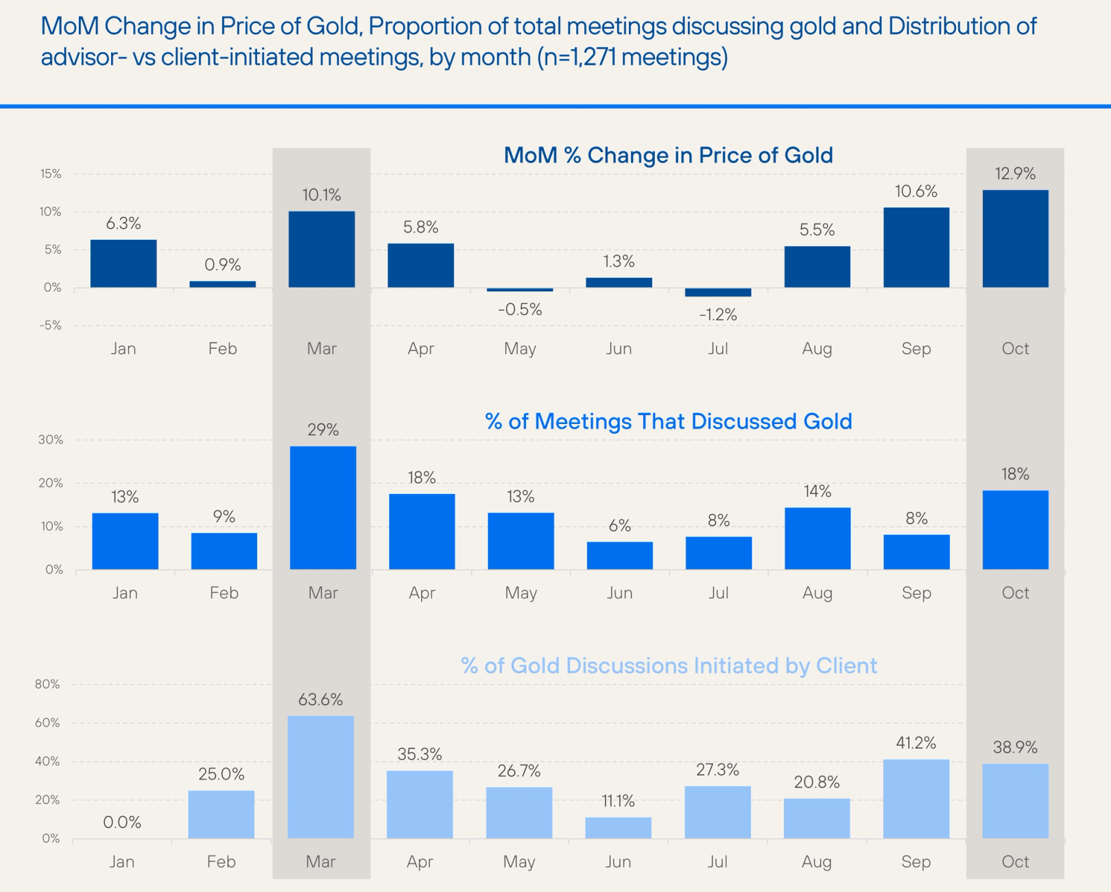 In March, 29% of meetings discussed gold and about 64% of those conversations were client-initiated; through the first two weeks of October, 18% of meetings discussed gold and roughly 40% were client-initiated, showing renewed interest as prices surged again.