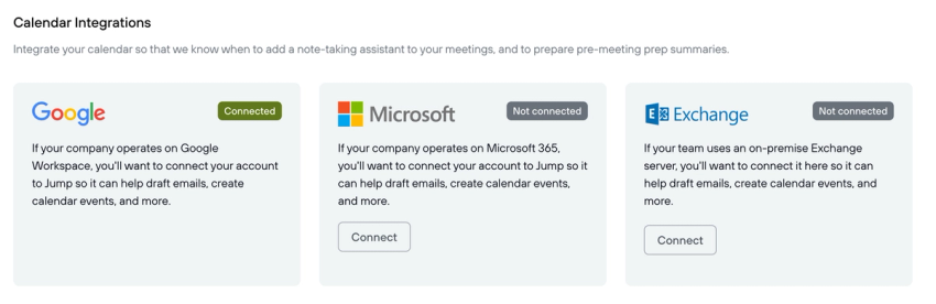 We just released an Exchange integration. Exchange users can now connect to their on-prem Exchange server, sync their calendar, and get the Jump notetaker in meetings automatically.