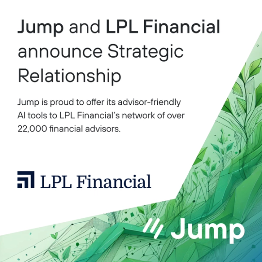 After a months-long selection process, we are excited to announce that Jump was named by LPL as a strategic vendor partner included in LPL’s Curated AI Advisor Solutions. “With AI Advisor Solutions we have sifted through the fintech noise to identify top tools that can transform how we all work, improving overall efficiency and elevating the value of financial advisors to the investors and families they serve,” said Greg Gates, CTO of LPL. Jump's AI meeting tools are now available to LPL’s network of over 23,000 financial advisors. Coverage of the announcement here.