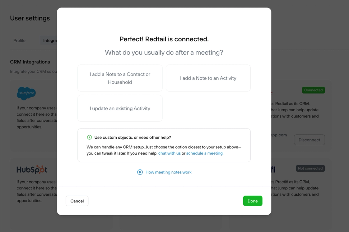 Now, whenever you connect a CRM, whether during onboarding, in the Getting Started guide, or from Integrations, Jump will automatically guide you to set up note syncing and create the appropriate automation. No manual setup required.