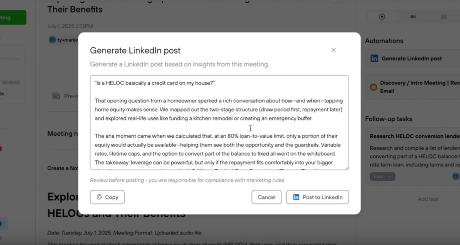 - After your meeting, open 'Generate Post' under Automations, review the draft, make any necessary edits, and then copy and paste it wherever needed.