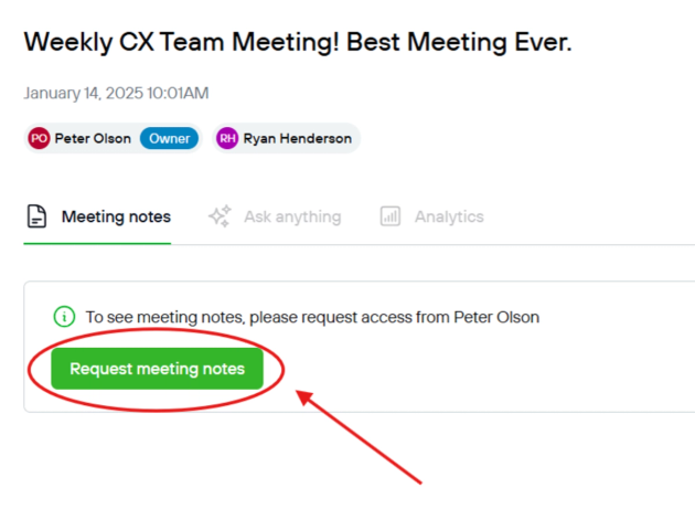 Missed a meeting? If it was hosted by another Jump user in your firm, you can now request access to their meeting notes. Simply navigate to "All past" on the left-hand side, select the meeting, and click the green "Request meeting notes" button. The meeting owner will receive your request and can approve or deny it.