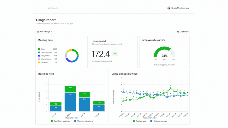 Now available to Account Owners on our Scale plan, Enterprise/Team Analytics dashboard designed for enterprise and team-level insights. Easily track meeting volumes, signups, CRM usage, and more—all in one place. Gauge user adoption, measure time saved, and drill down into key metrics like “Meetings Held” and “Action Items Created.” Whether you’re a large firm or a growing team, these dashboards give you the clarity you need to make data-driven decisions.