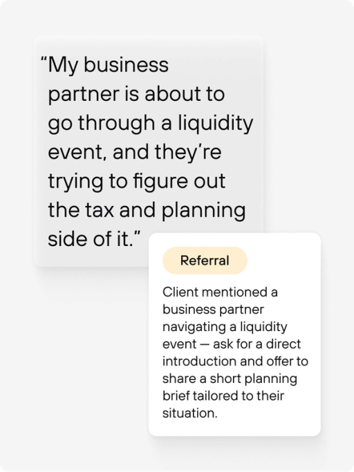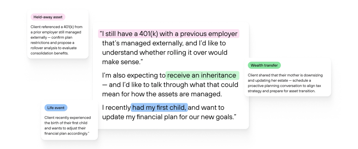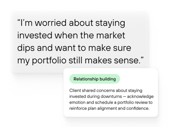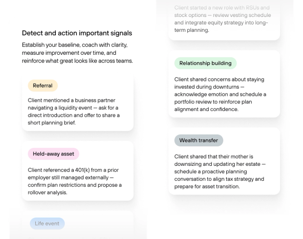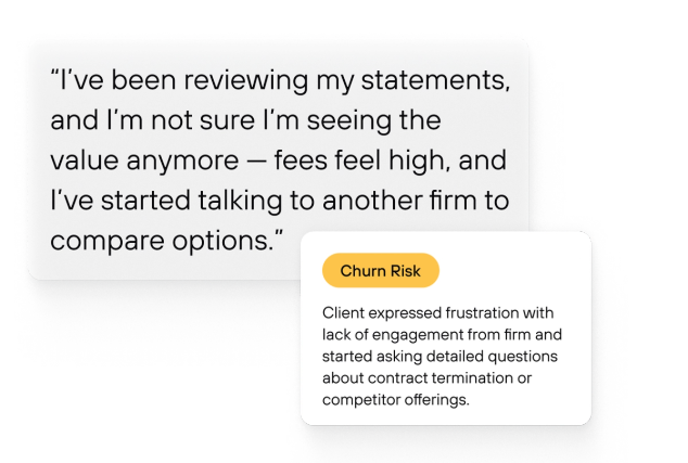 Signals listen for what clients actually mean, then surfaces held-away assets, referral cues, churn risk, and intent shifts so your team can follow up while it still matters.