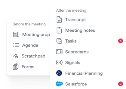 Generate pre-meeting briefings and capture structured notes automatically. Walk in prepared, stay present during the meeting, and leave with documentation already done.