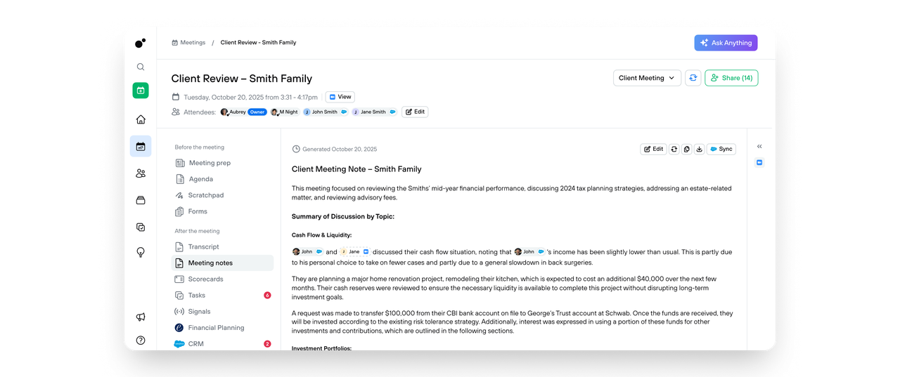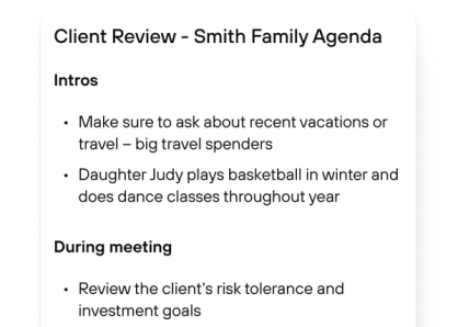 Generate structured agendas that guide the conversation and keep meetings focused on client goals, planning priorities, and next steps.