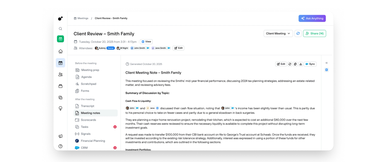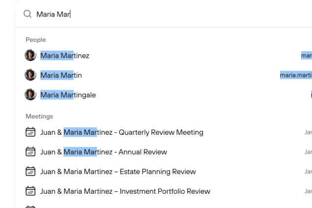 Find anything from any conversation instantly. Search meetings, notes, transcripts, and client interactions to surface the context you need.