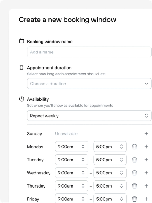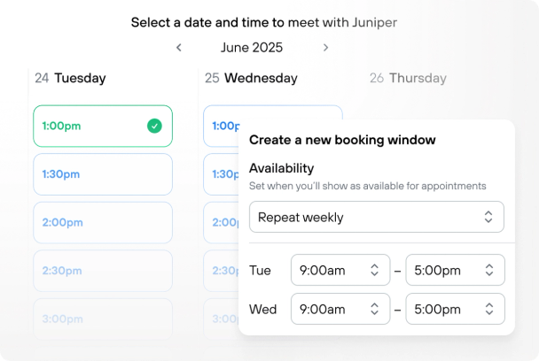 Set your own availability by the hour, day, or week. Create multiple booking windows for different meeting types — portfolio reviews, quick check-ins, prospect calls — each with its own duration, conferencing, and buffer rules.