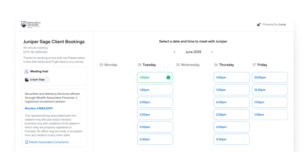 Advisors don't just need scheduling — they need scheduling that their compliance team will actually approve. Jump lets firms attach disclosures to every client-facing booking page, archive every email confirmation, and maintain a full audit trail of who booked what and when.
