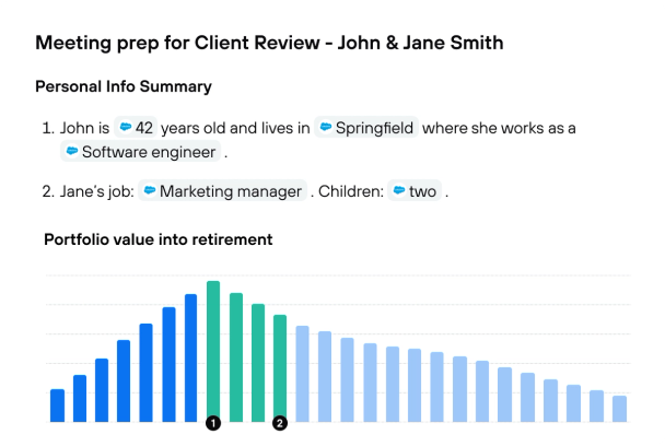 Prep outputs include inline source references — so when it mentions a portfolio change, a planning conversation, or a recent email exchange, you can click through to the original record. No black-box summaries. You can verify anything in seconds.