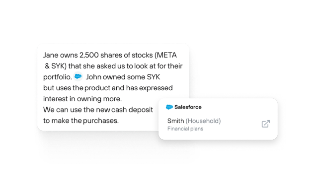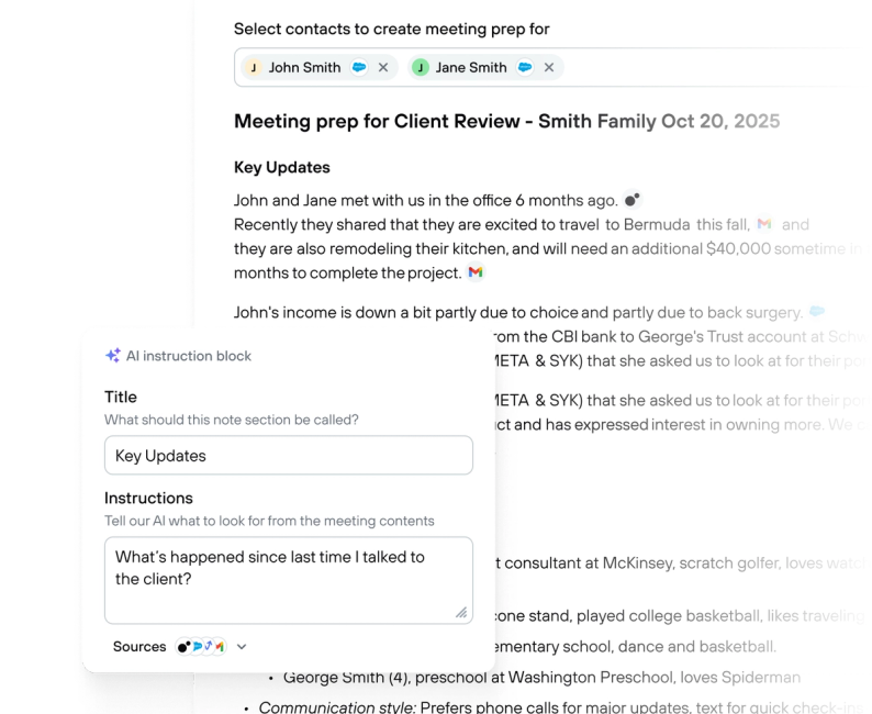 CRM notes, portfolio positions, financial plans, tax data, estate planning records, email threads, and past meeting context — all pulled together automatically and cited back to the source.