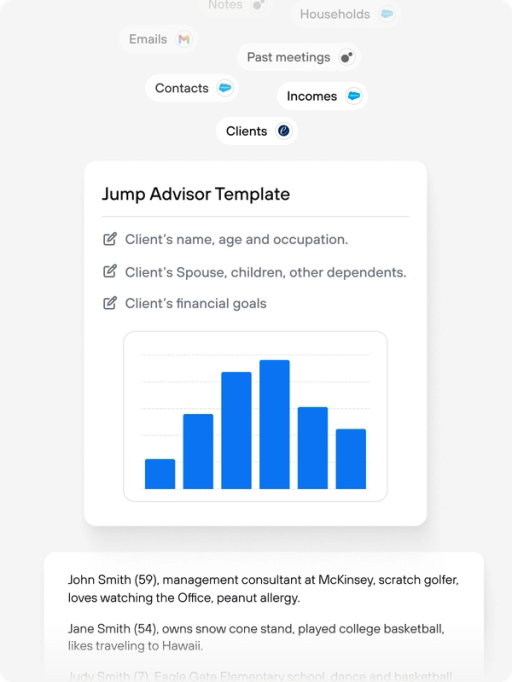 Jump connects to your CRM, portfolio accounting, custodian, financial plans, tax records, emails, and past meetings — then delivers a structured, cited briefing to your inbox before you walk in the room.